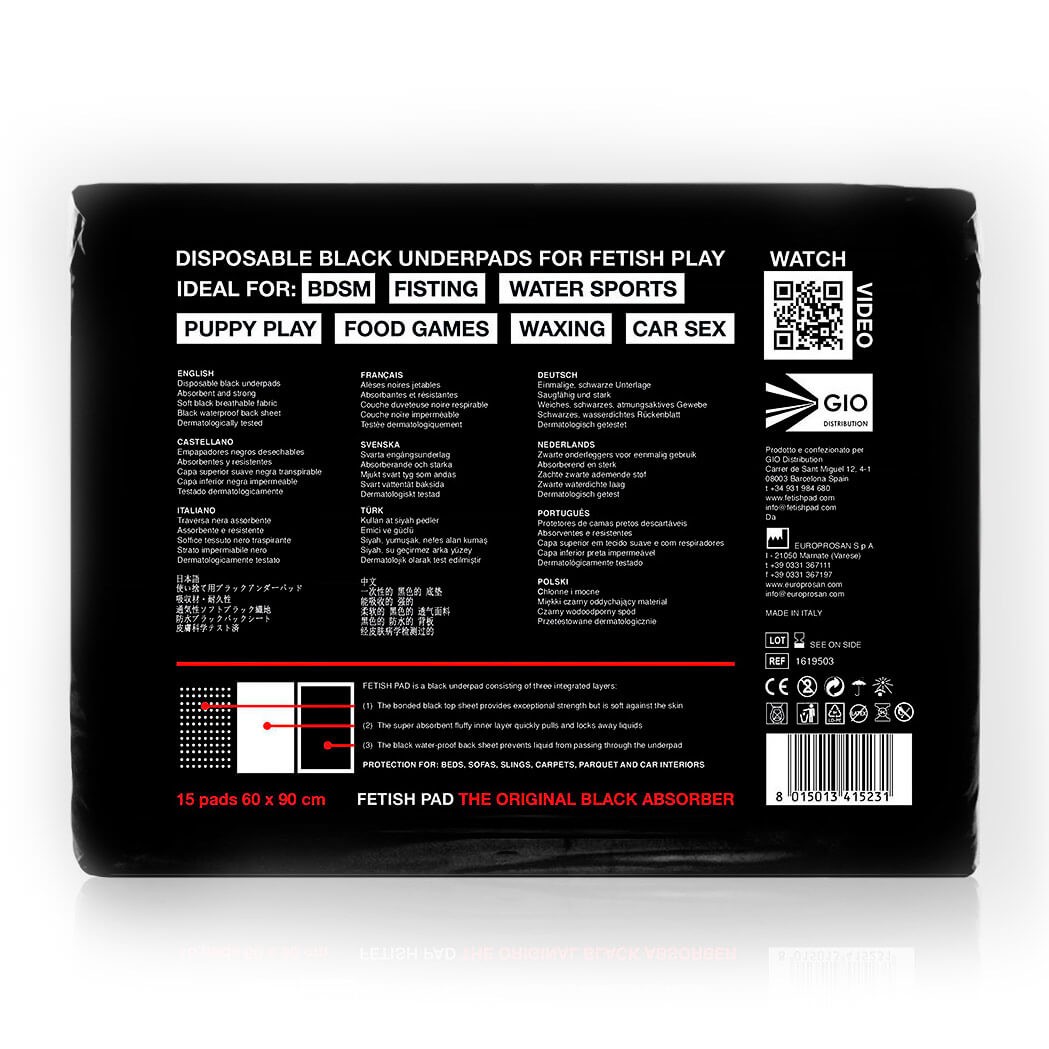 A pack of FETISH PAD contains 15 individual black underpads each measuring 60 x 90 cm. It protects furniture and vehicle interiors. It saves on time spent cleaning up after a session – simply fold it up and throw it away. It looks good and therefore adds to the atmosphere of a sex session unlike the unattractive clinical appearance of ordinary white underpads. It’s light weight and portable, perfect for playing away and hotel rooms.