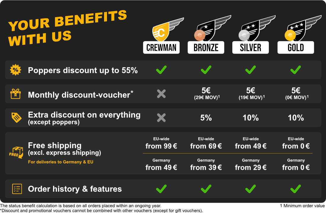 Important combination note: Poppers tier prices (up to 55%) always apply – the extra discount for Bronze/Silver/Gold is added on top for all other products.