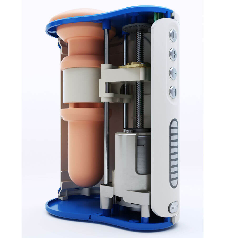 Inside the robust housing there is a powerful motor that rhythmically moves a stable suspension with pearl-studded massage arms up and down. A sleeve for the penis is in turn inserted into this suspension. The sleeve with mouth opening is suitable for ALL penis lengths.