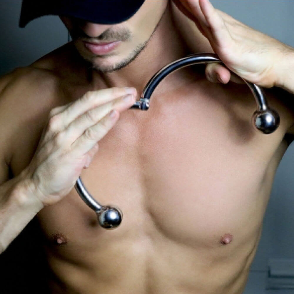 The barbell collar is an absolute eye-catcher! The massive piece of jewelry is made of stainless steel and has a sophisticated locking mechanism. The two large balls with a diameter of three cm put your neck and the collarbone region in the limelight.