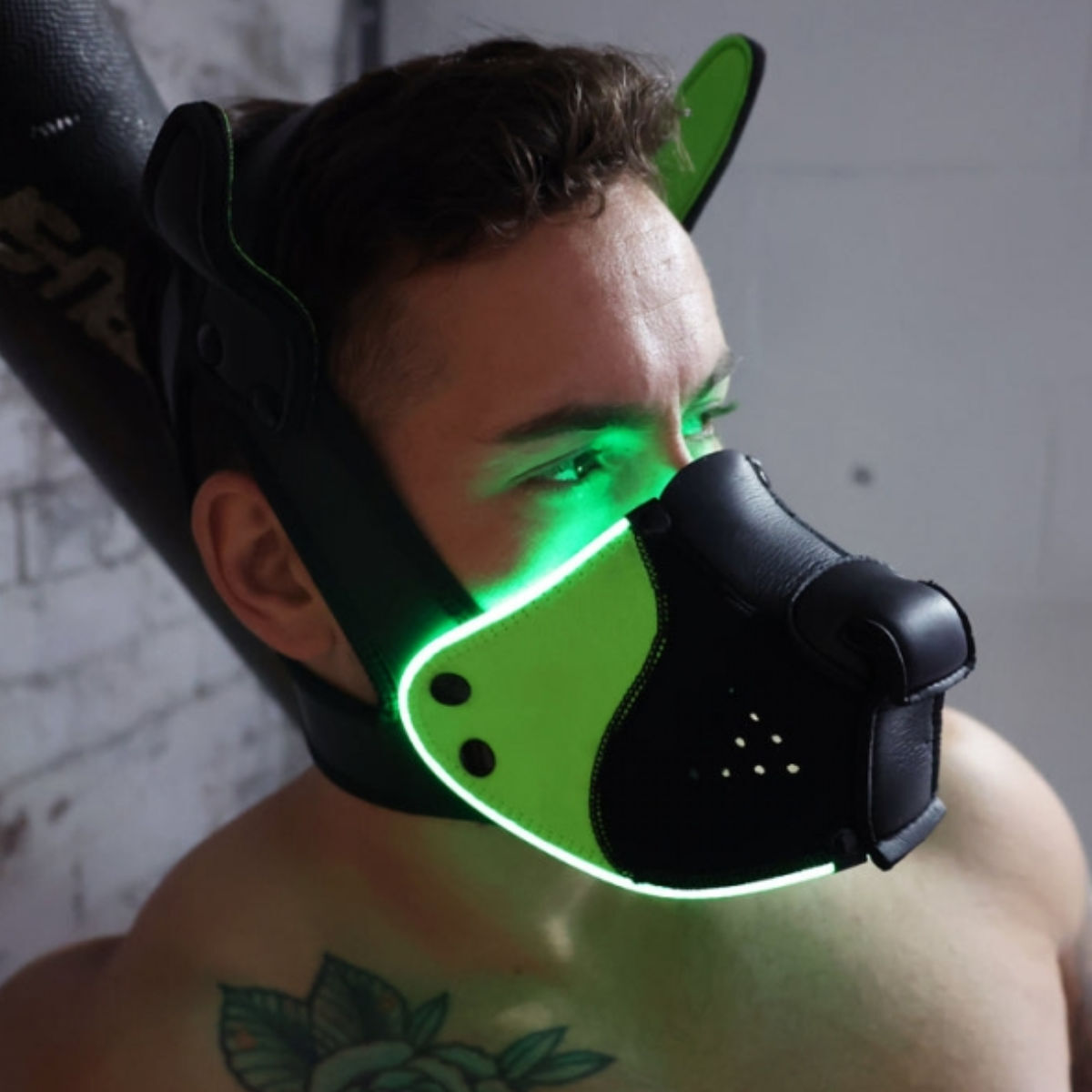 Fulfill new roleplay fantasies with this awesome glow-in-the-dark puppy mask! Just the thing for submissive dogs, because they never get lost and are caught again even in the darkest dungeon ;)