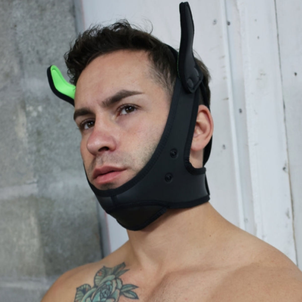 This mask is made of rubberized neoprene and can be easily attached securely to your head with a Velcro fastener. The ears are adjustable and the muzzle can be removed.