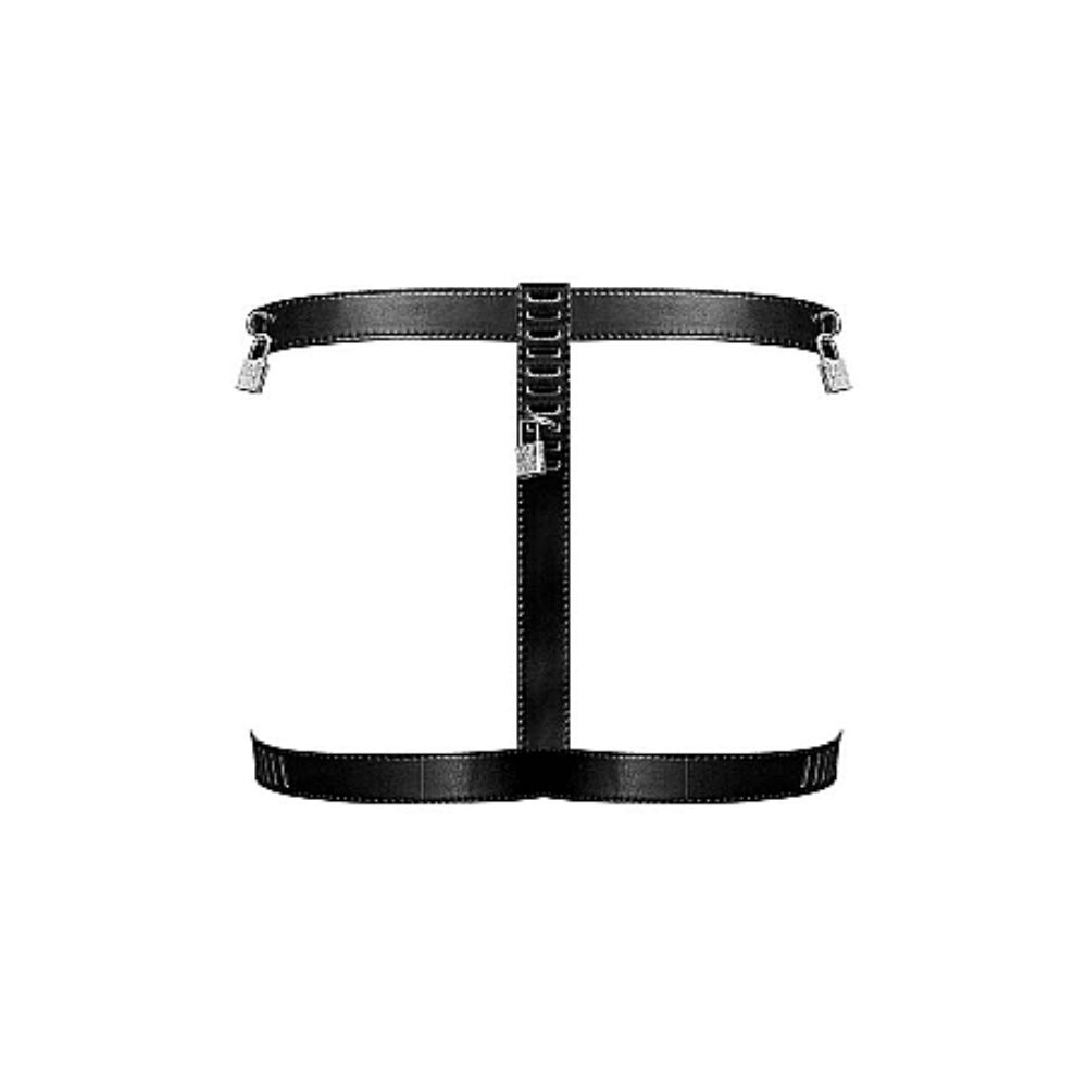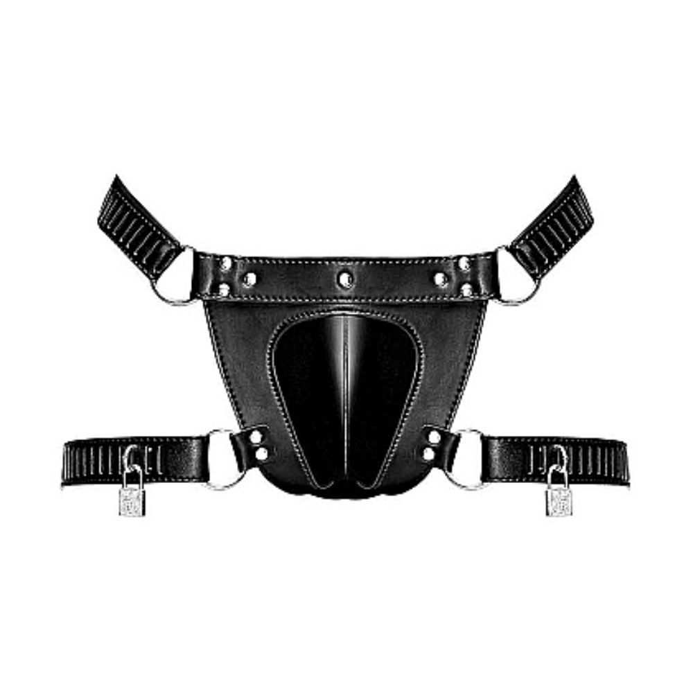 The string completely locks the front part of your sub's genital-region. Masturbation through friction, chafing or stimulation through movement is also prevented. The belt is fully adjustable and comes in one size.