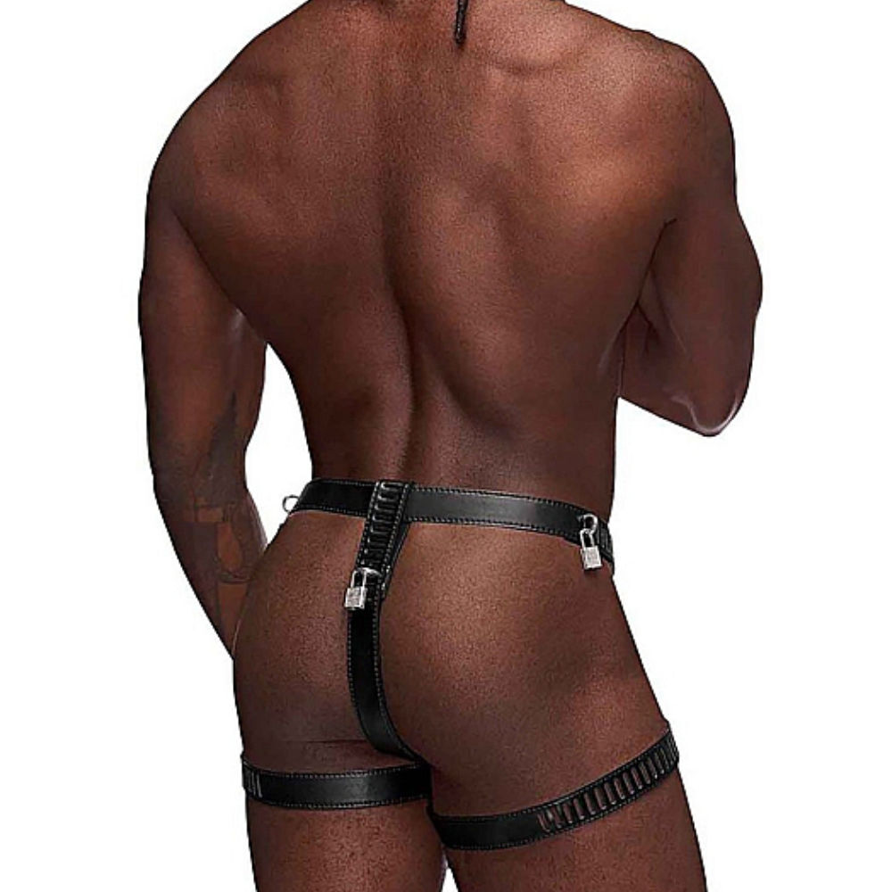 With this seductive, high-quality chastity string made of black faux-leather, you will be deciding what's happening next in the sheets! Your sub will only be sexually active if you allow him to be! Perfect for all fetish sessions, whether you're dominant or submissive.