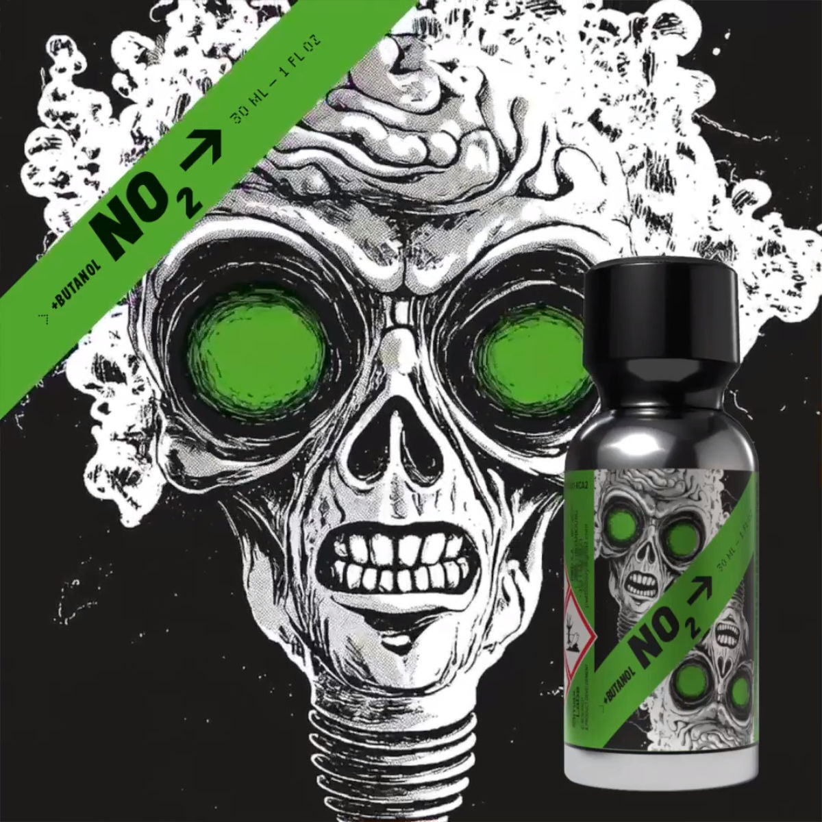 NO2 Butanol 30 ml combines style and substance in a spectacular, glowing green bottle featuring a hypnotic zombie design. This poppers makes a clear statement: rebellious, transgressive, and unconventional. The vivid green accents on the silver bottle instantly catch the eye and make NO2 Butanol the perfect companion for nights when rules do not matter.