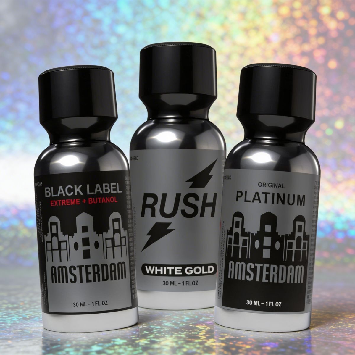 If you don’t want to choose between elegant, brutal, and iconic, just take all three. This 3-pack combines Amsterdam Black Label Extreme XL, Rush White Gold XL, and Amsterdam Platinum XL — three large 30 ml bottles built for bedroom chaos, darkroom energy, and weekends that are clearly heading in the wrong, very right direction. From dirty pressure to polished luxury and no-nonsense intensity, this set gives you three distinct ways to lose your mind in style.