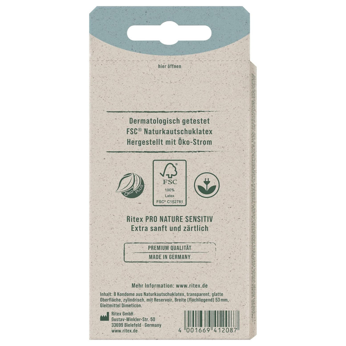 Ritex offers you eight innovative condoms that not only fit perfectly and provide a pleasant natural feeling, but are also made with ecological aspects in mind. They were made with EKOenergy green electricity from 100% FSC-certified natural rubber latex and come in a box made of grass fiber and recycled paper. Here you have an all-round good feeling!