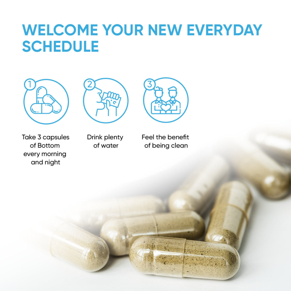 With BOTTOM, you’re prepped without locking yourself in the bathroom for hours. Simply take 2–3 capsules with plenty of water (at least 400 ml) in the morning and evening – and your body will take care of the rest, nice and easy. After a few days, you’ll notice: everything’s running... slick as ever.