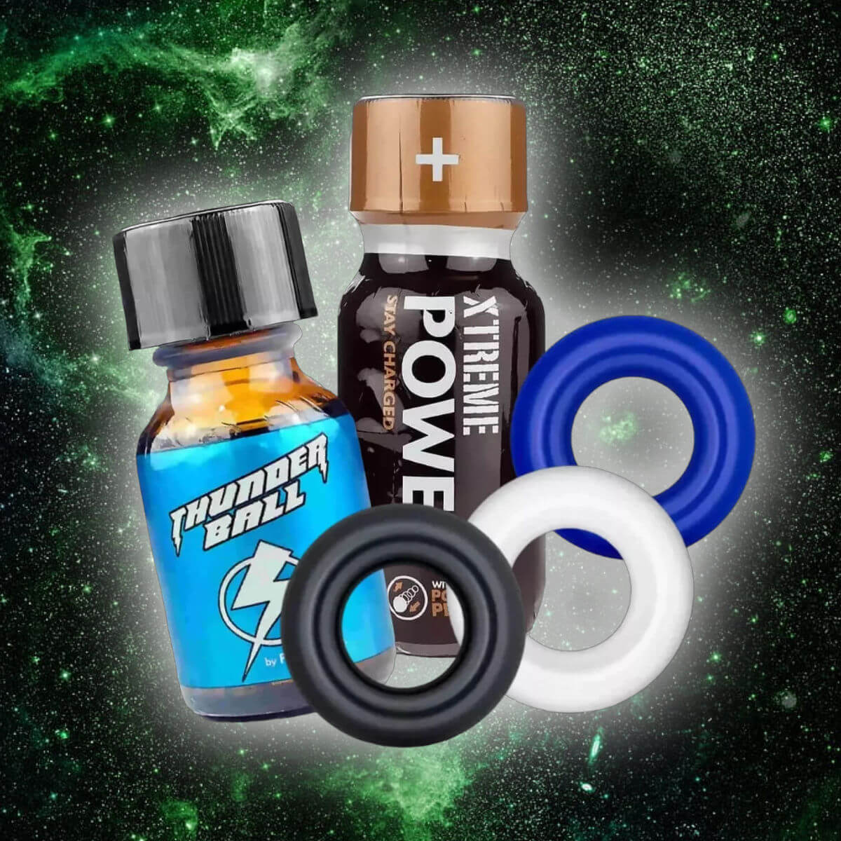 With the two poppers, Xtreme Power Poppers and Thunderball S you have two of our most popular little helpers at the start to get you sizzling hot and dirty! And with our Power-Plus Basic Cock Ring Starter Set, you also have just the right accessory for your cock at hand! So you have everything you need to pursue your dirty thoughts intensively and fuck with power all night long!