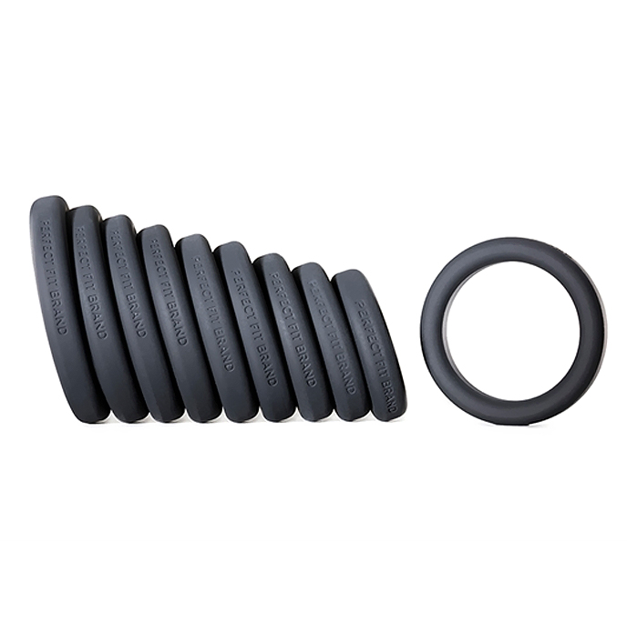 Nine rings with increasing diameters (from 2.8 cm to 4.8 cm) made of flexible, medically pure silicone on a practical PVC cone for storage. Get rid of the chaos in your toy drawer and finally find exactly the size that suists best your best piece - enjoy yourselve!