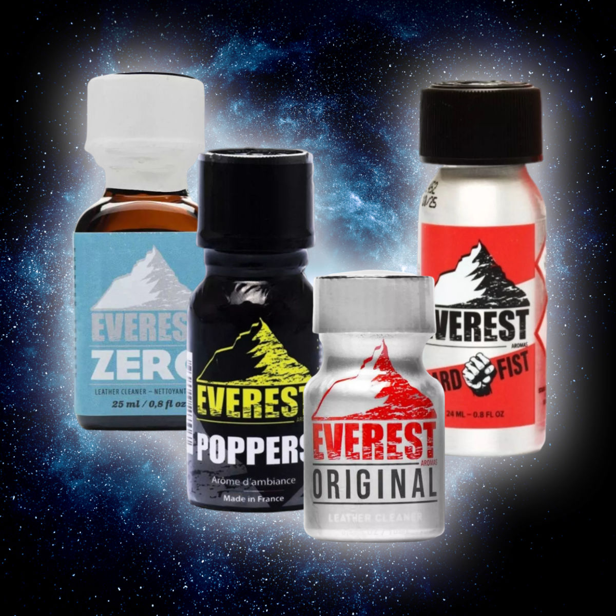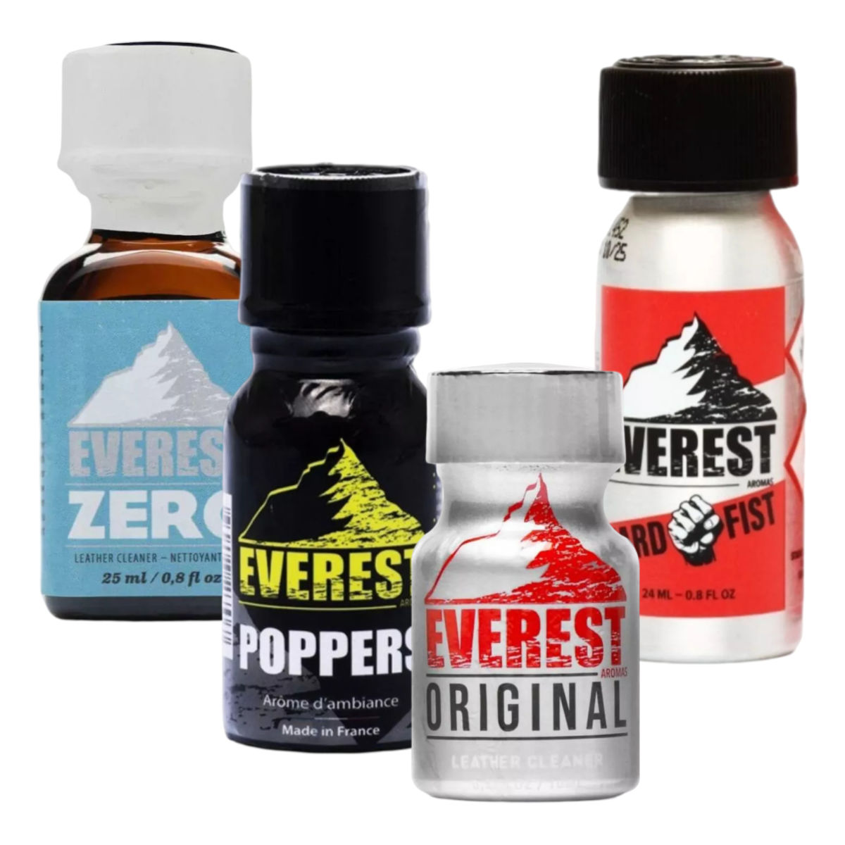 Ever tried Everest poppers? For years these aromas have been some of our most popular flavors, and now they come as a set in a handy savings pack! The wide selection of ingredients of different strengths will dull your senses with lust, and you will experience true heights of pleasure. A few well-placed sniffs, and you're ready to climb any cock!