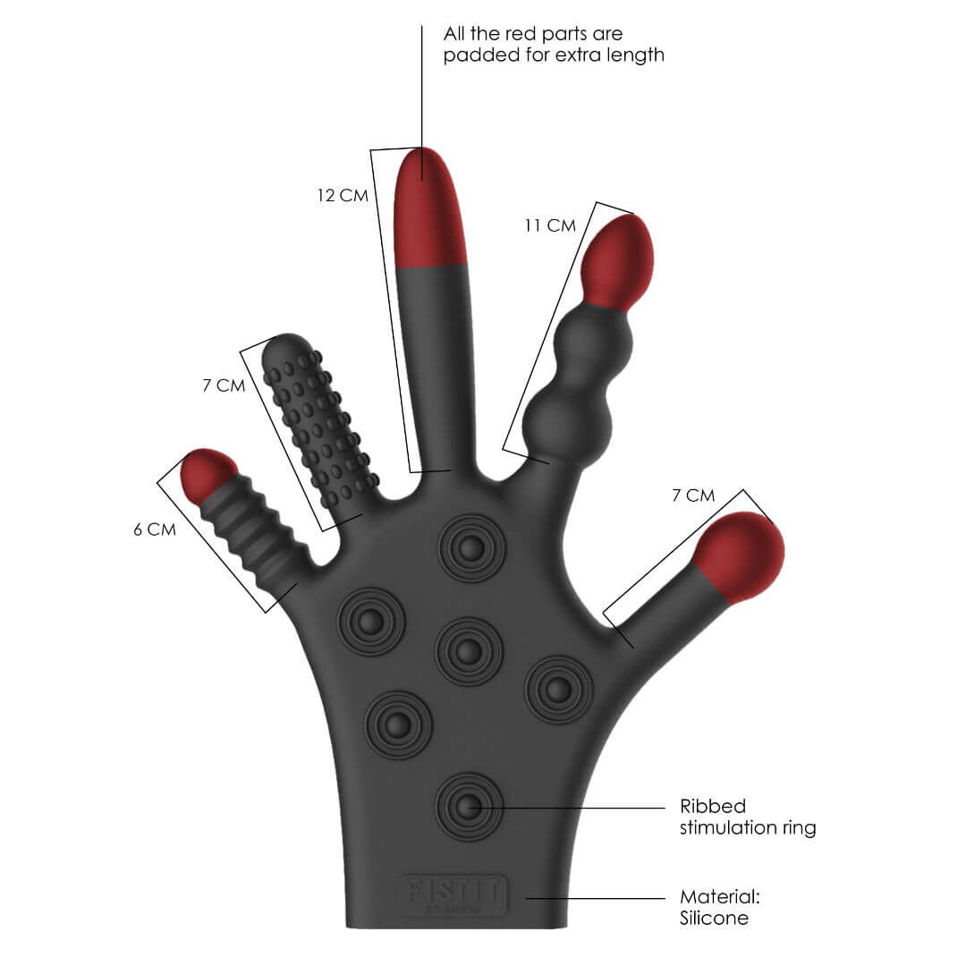 Jeder Finger dieses dehnbaren Silikonhandschuhs hat eine eigene Struktur für die besondere Abwechslung beim Spielen! Glatt, gerippt, genoppt, verdickt... Die Handfläche hat eine genoppte Oberfläche, die einen Handjob oder eine Masturbation besonders aufregend macht; Teilweise sind die Finger für Extrastimulation noch verstärkt und verlängert. Egal ob alleine oder mit einem Partner, dieser Handschuh zeigt Dir die wahre Liebe!