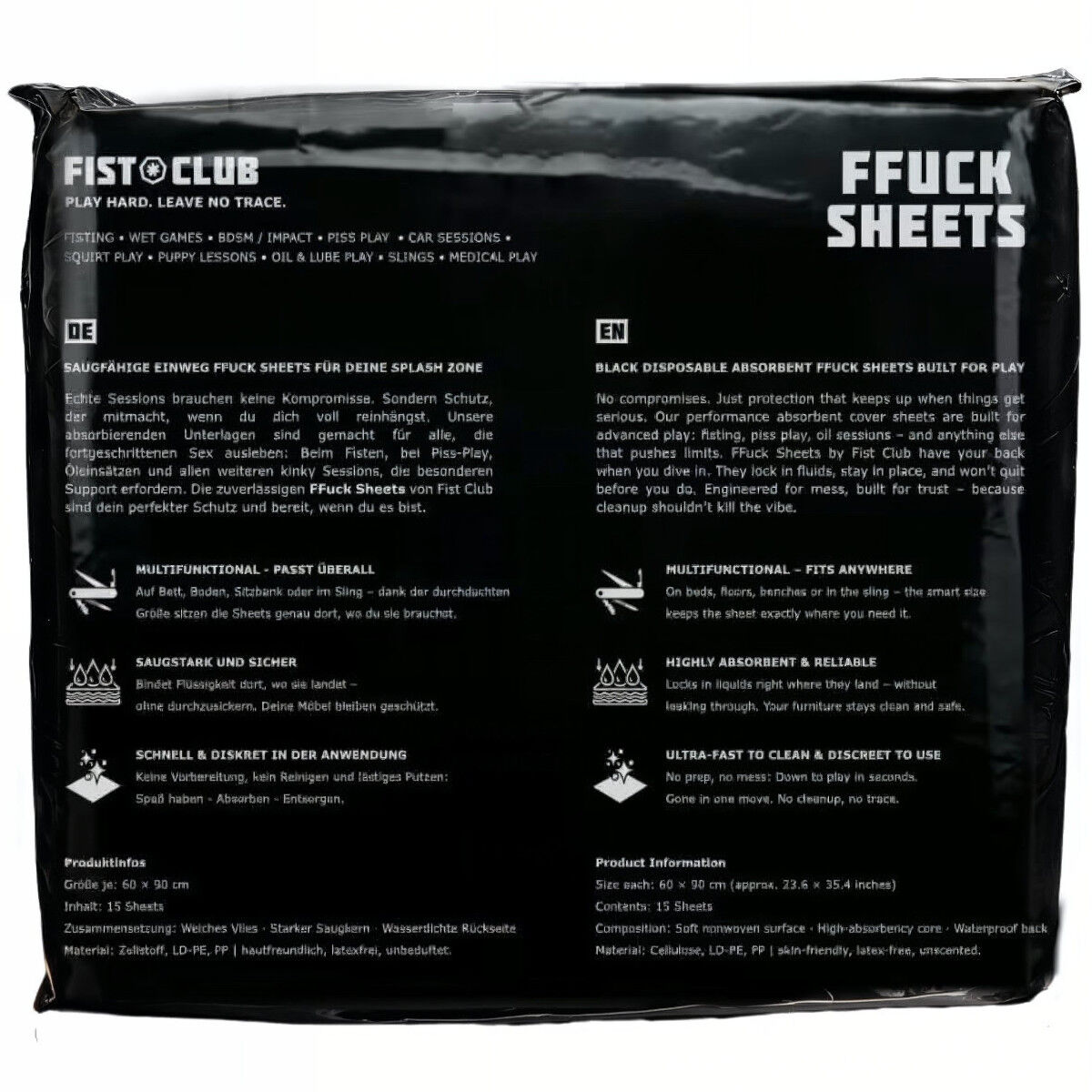 Echte Sessions brauchen keine Kompromisse. Sondern Schutz, der mitmacht, wenn du dich voll reinhängst. Unsere absorbierenden Unterlagen sind gemacht für alle, die fortgeschrittenen Sex ausleben: Beim Fisten, bei Piss Play, Öl-Einsätzen und allen weiteren kinky Sessions, die besonderen Support erfordern. Die zuverlässigen FFuck Sheets von Fist Club sind dein perfekter Schutz und bereit, wenn du es bist.