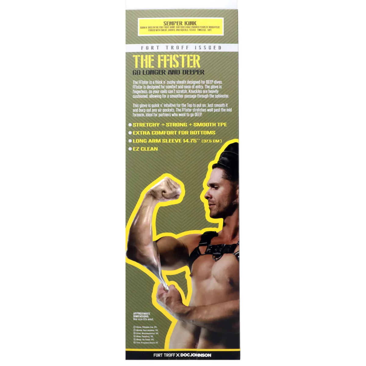 Zusammen mit echten Fisting-Experten hat Fort Troff einen Handschuh entwickelt, der dich schnell, sicher und vor allem tief eindringen lässt!  Gefertigt aus dick gepolstertem TPE, sorgt der Handschuh für ein mega bequemes Erlebnis für den Bottom. Keine Sorge mehr wegen Fingernägeln oder Knöcheln – mit dem FFister gleitet alles geschmeidig und mühelos. Der Handschuh ist blitzschnell angezogen: einfach glattstreichen und alle Luftblasen rausdrücken. Er reicht bis über den halben Unterarm und sorgt so für ein nahtloses und gepolstertes Fisting Erlebnis.