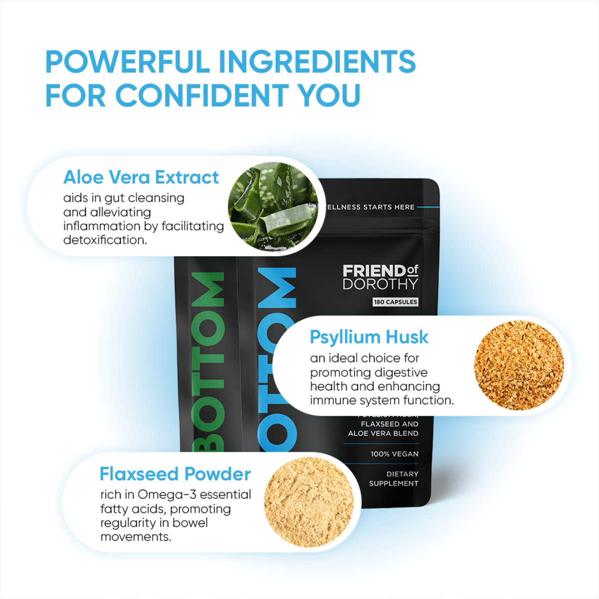 BOTTOM ist das tägliche Must-Have für alle, die gerne hemmungslos-versaut loslegen möchten, ohne sich den Kopf vorher zu zerbrechen. Mit seiner cleveren Mischung aus Flohsamenschalen, Leinsamen und Aloe Vera bringt dieses vegane Nahrungsergänzungsmittel deine Verdauung geschmeidig in Balance. Kein Blähbauch, kein nervöses Vorbereiten – nur ein gutes, sauberes Gefühl. Mit Bottom machst du dich easy & schnell bereit für dein nächstes Date!