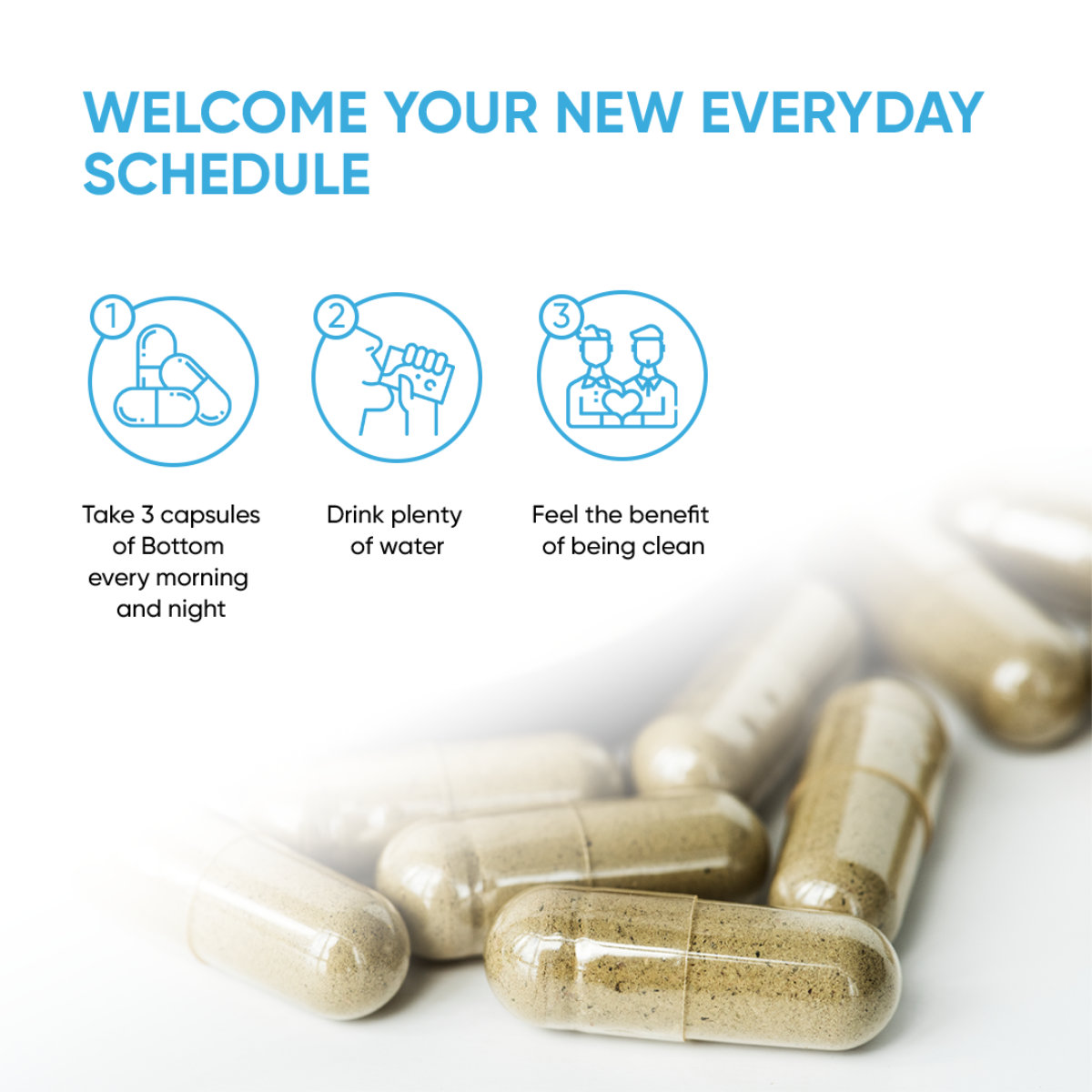 Mit BOTTOM bist du vorbereitet, ohne stundenlang im Bad zu verschwinden. Einfach morgens und abends 2–3 Kapseln mit viel Wasser (mind. 400 ml) schlucken – und den Rest macht dein Körper ganz entspannt von allein. Nach ein paar Tagen wirst du merken: Da läuft alles... wie geschmiert.