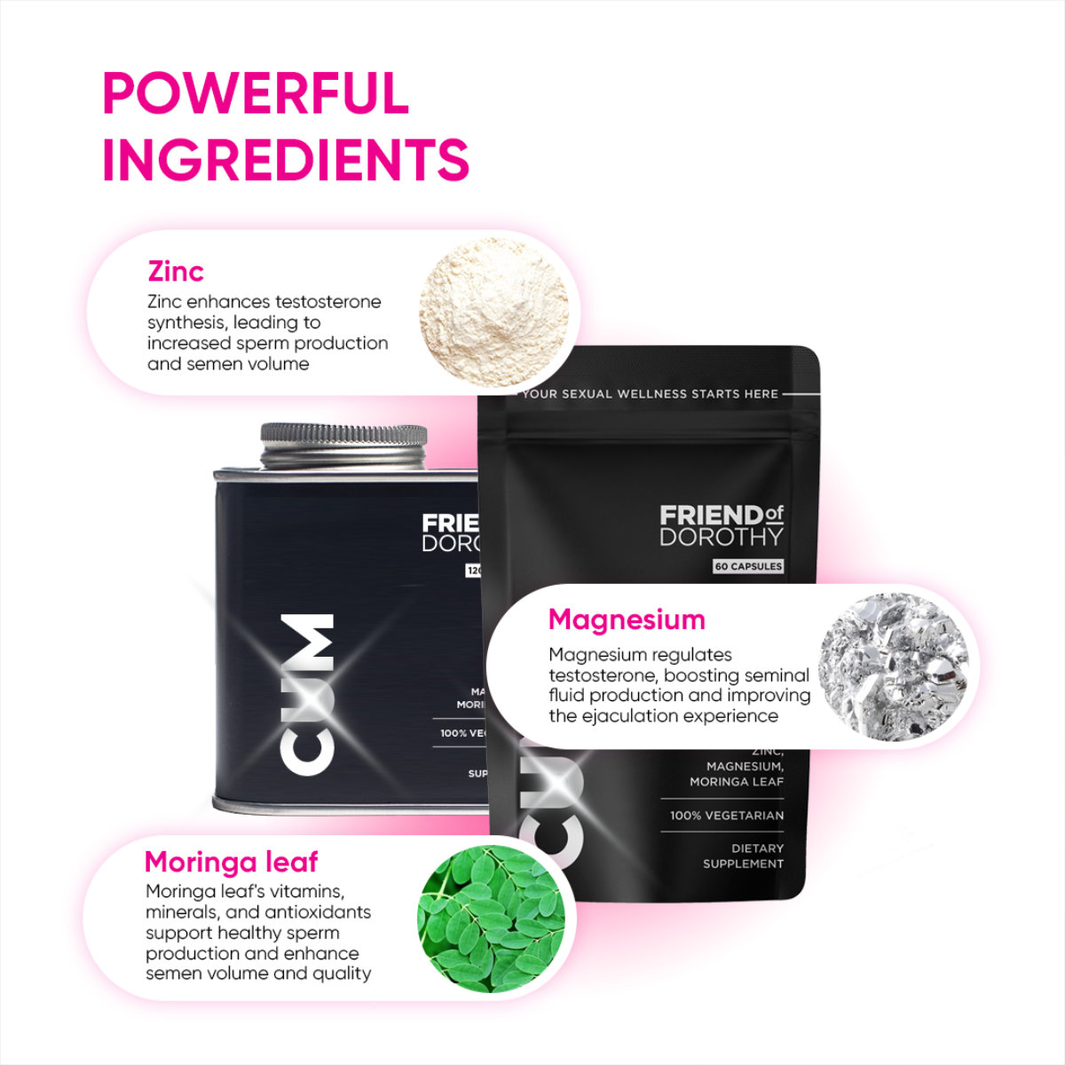 CUM ist dein täglicher Power-Boost für mehr Ladung, intensivere Orgasmen und den ultimativen „fuck yes“-Moment beim Abspritzen. Die starke Kombi aus Zink, Magnesium und Moringa bringt deine Prostata auf Hochtouren, kurbelt die Spermienproduktion an und macht aus jedem Schuss eine echte Show.