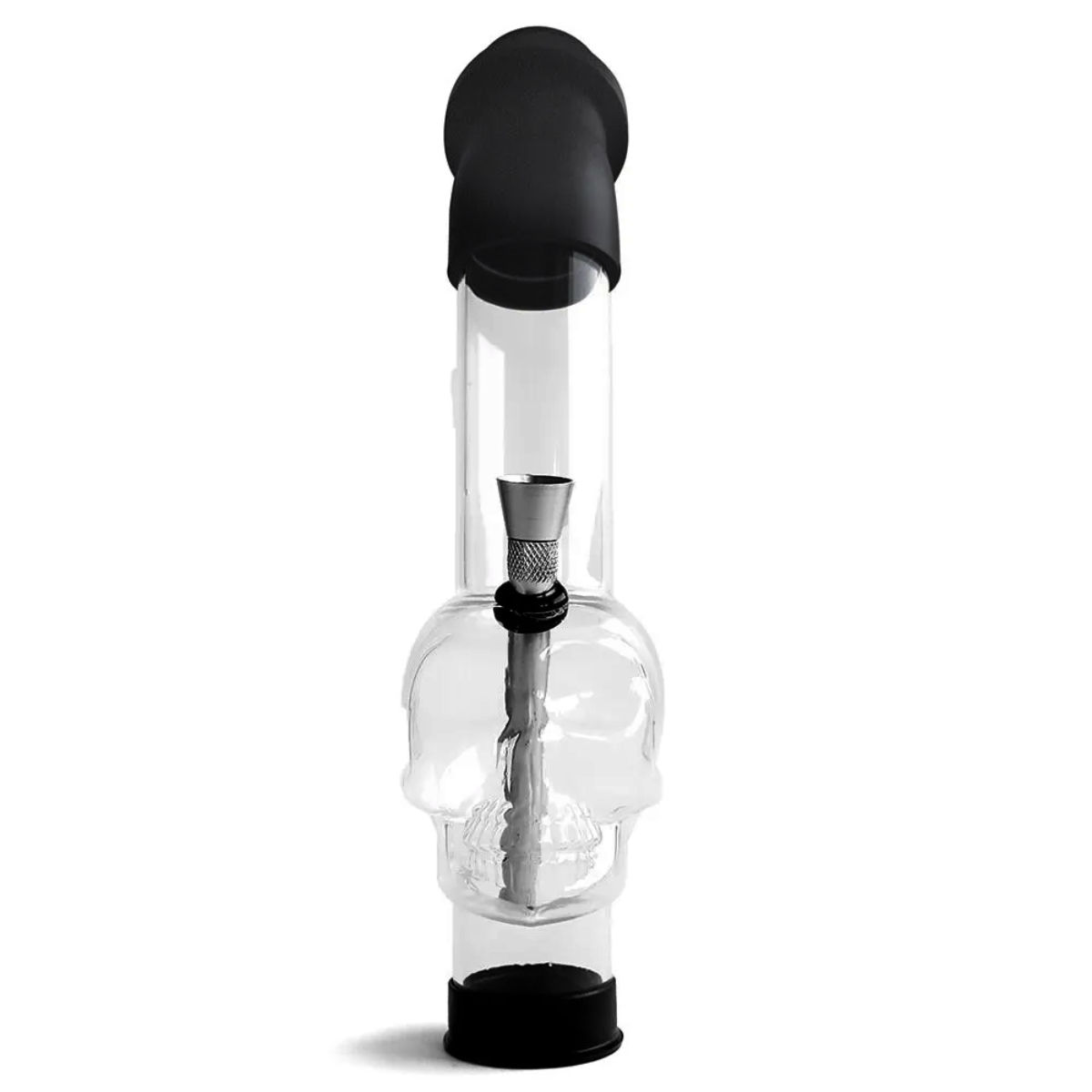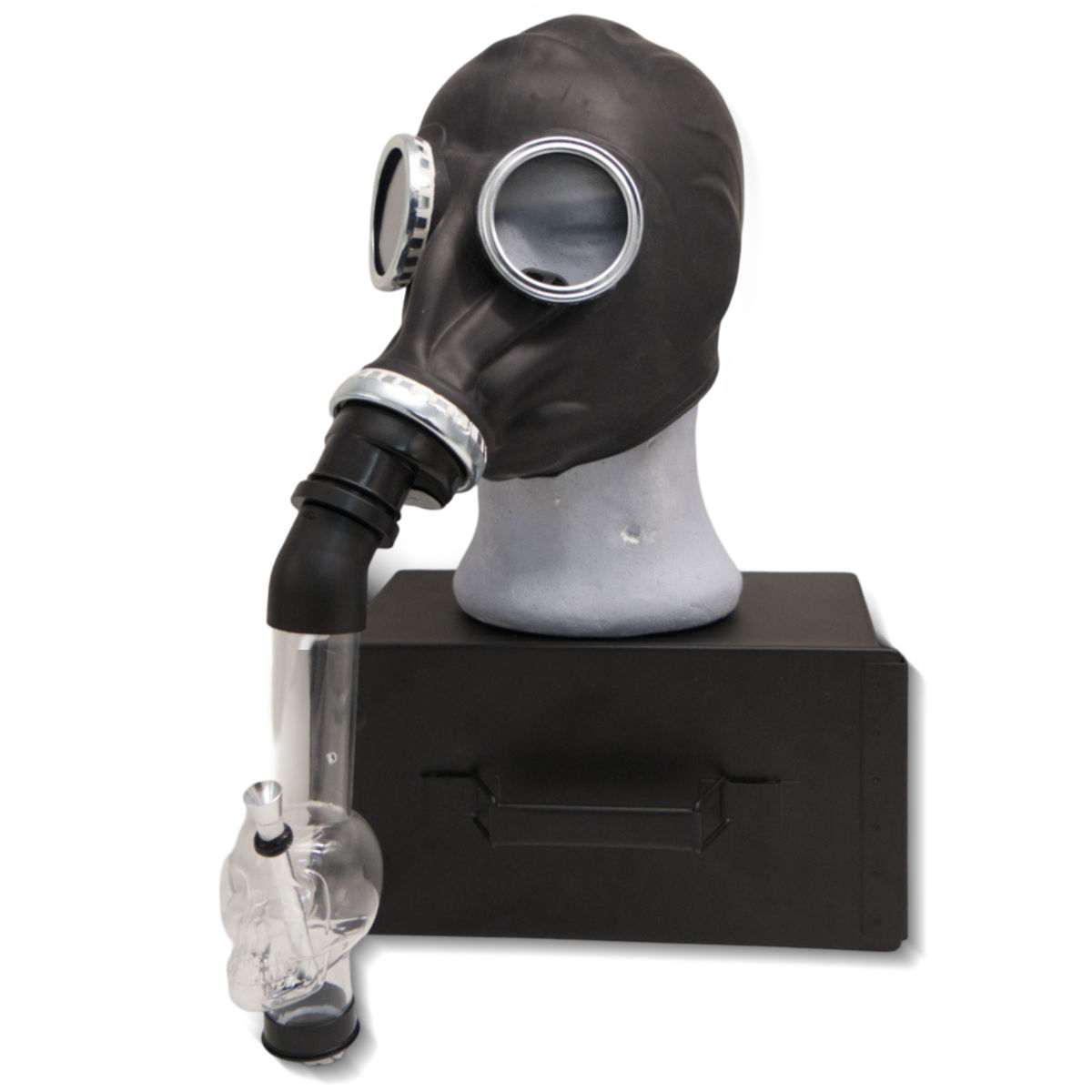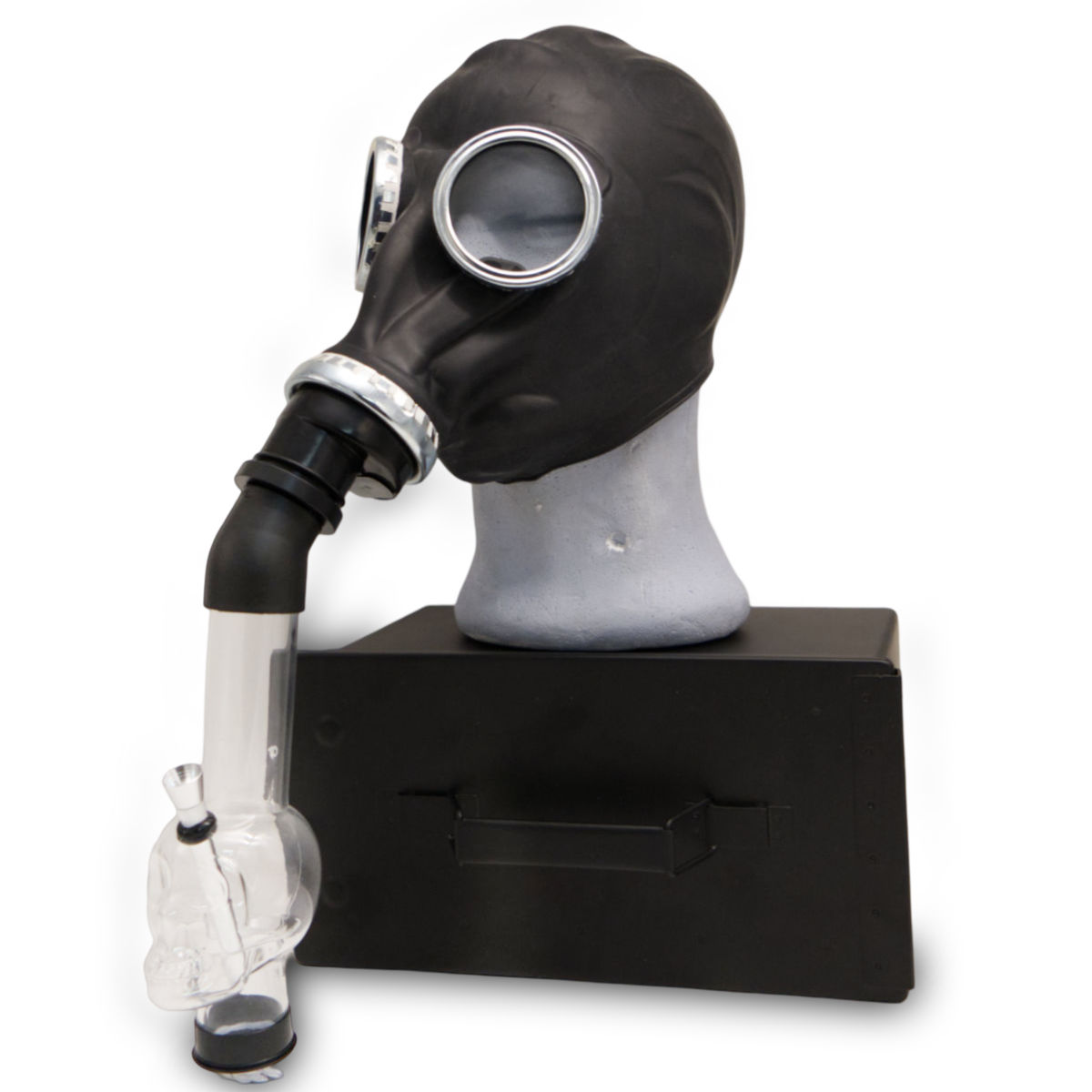 Einfach an jede Gasmaske mit M40-Gewinde am Luftansaug-Anschluss dieses geilen Bong mit Skull-Optik anschrauben, und schon bist du startklar für den Kick deines Lebens.