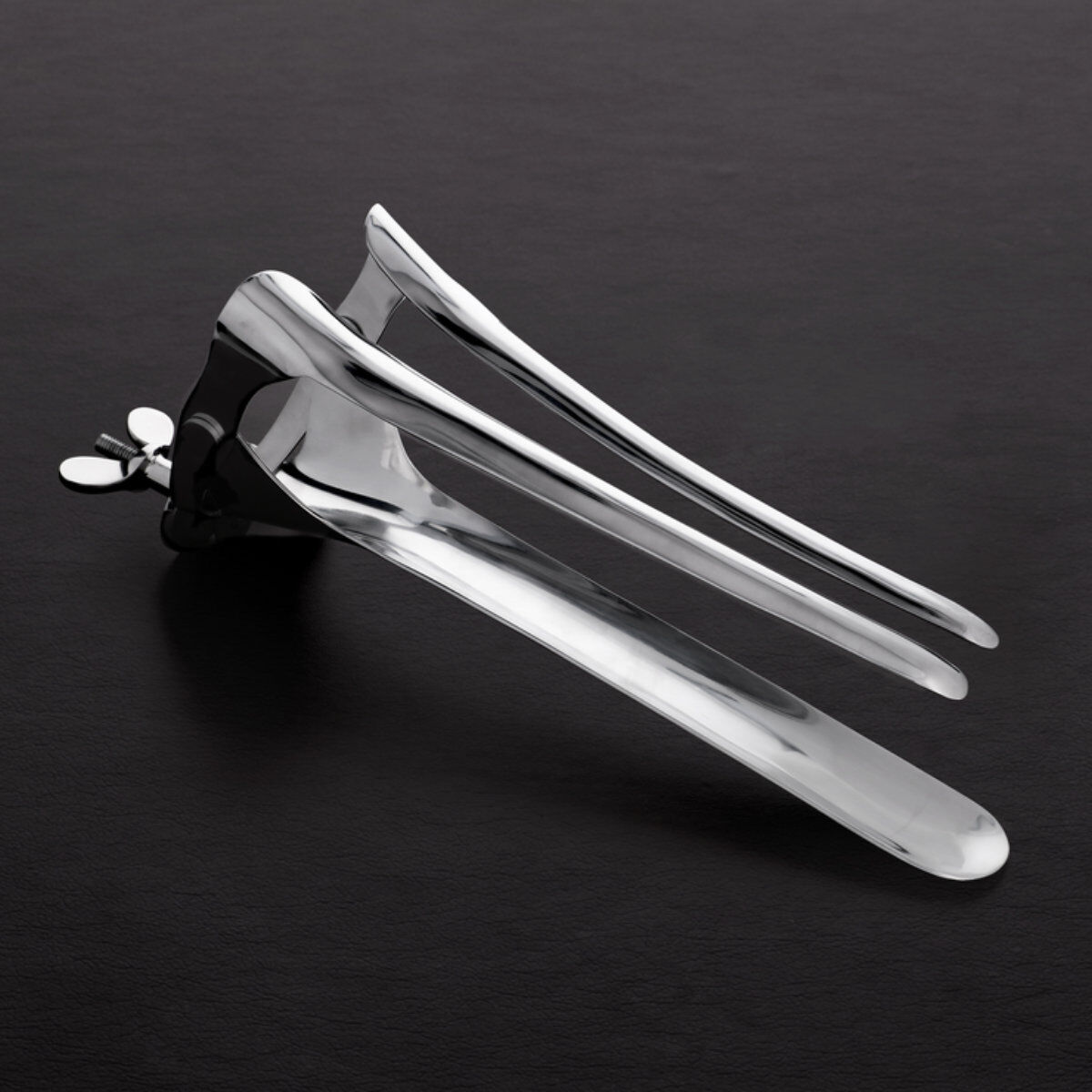 Das Speculum hat eine Gesamtlänge von 43 cm und ist nichts für schwache Nerven: Die Arme lassen sich auf beinahe 10 cm spreizen! Durch eine Flügelschraube lässt sich das Speculum arretieren, sodass du durch die Öffnung hindurch diverse Sachen einführen kannst.