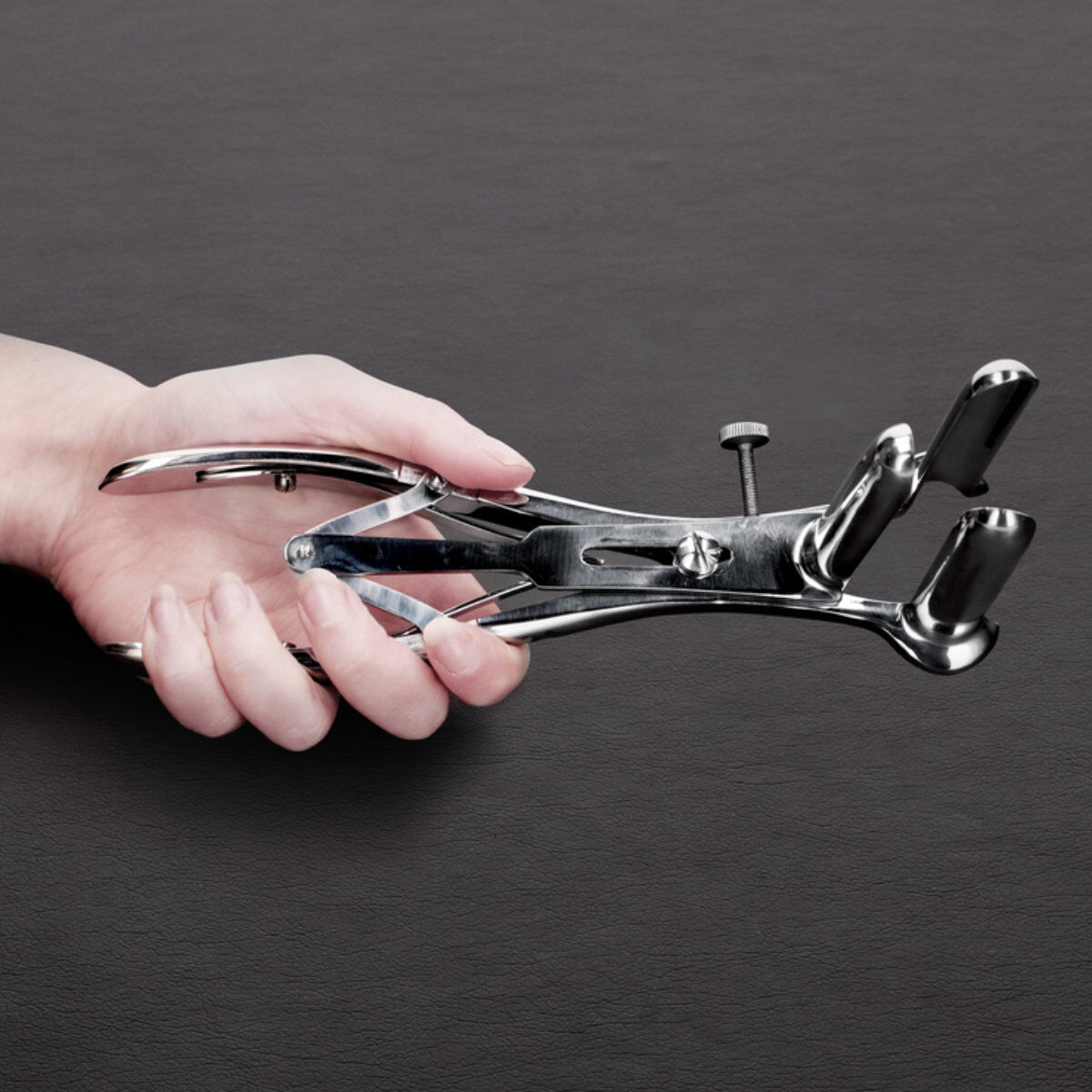 Das Speculum hat 3 Finger, die sich gleichmäßig ausdehnen und sich dank der Schrauben stufenlos arretieren lassen. Im geschlossenen Zustand hat es einen Durchmesser von 2 cm und gespreizt bis zu 6,3 cm.