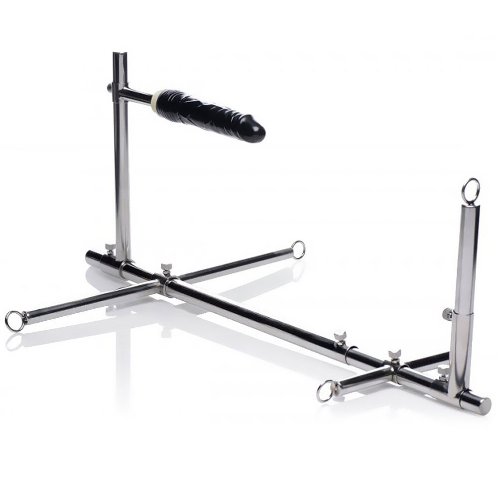 Alle Teile dieser bemerkenswerten Vorrichtung sind verstellbar, so kann die Basisleiste verlängert werden, die Höhe des Dildos und des Halsbands angepasst und die Position der Handgelenke und Knöchel verändert werden.
