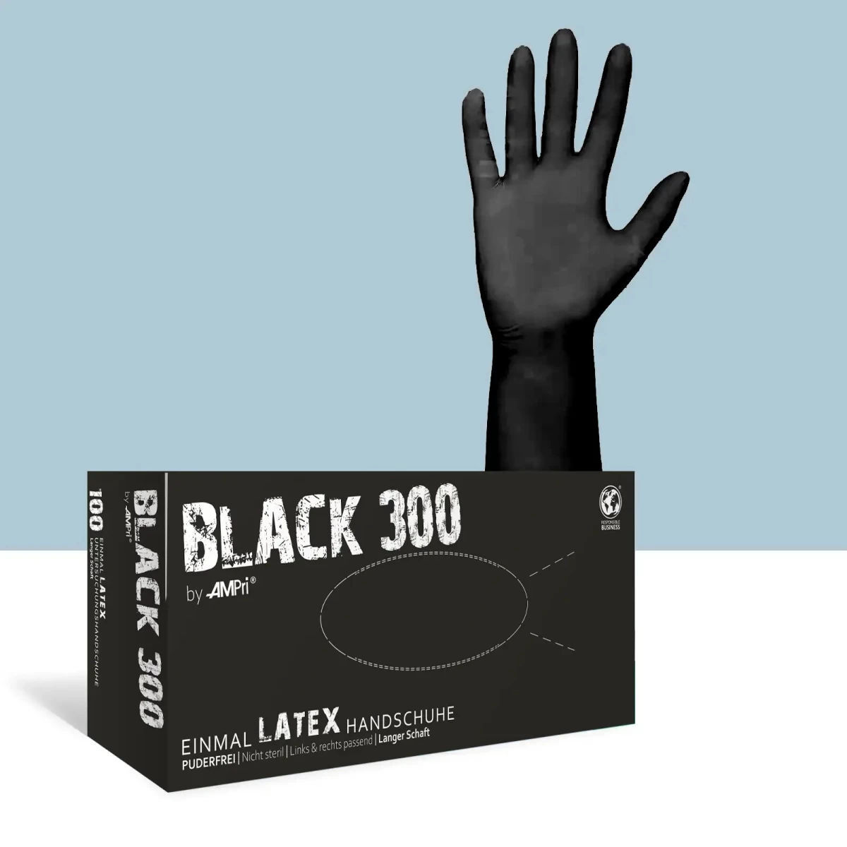 Einmalhandschuhe in Überlänge aus Latex, puderfrei, in schwarzer Farbe, lebensmitteltauglich, Neuware, in praktischer Entnahmebox. Die Handschuhe gehen etwa bis zur Hälfte des Unterarms.