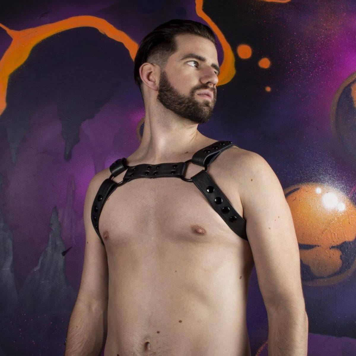 Mit diesem maskulinen Harness in edlem Schwarz bist du perfekt ausgestattet für Dein nächstes heißes Sexdate und glänzt in jeder Lage. Die weichen Lederriemen sind mit schwarzen Nieten und Druckknöpfen versehen, die dem Harness einen unaufdringlichen, aber doch sexy Charakter geben.